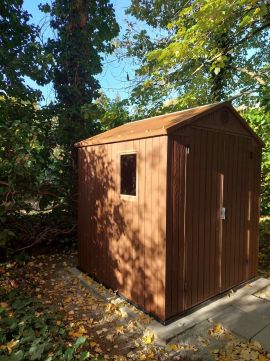 A ház mögött egy fa hatású műanyag tároló ad helyet a kerti szerszámoknak, strandfelszereléseknek és egyéb letárolandó dolgoknal.