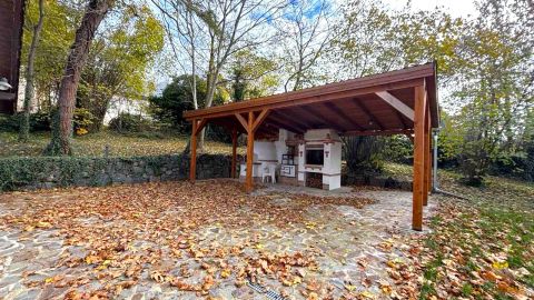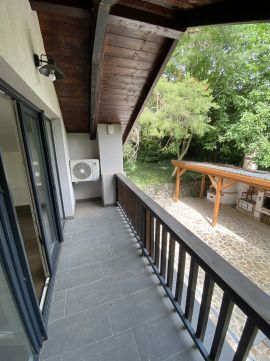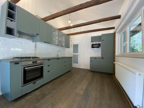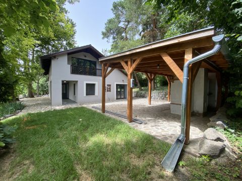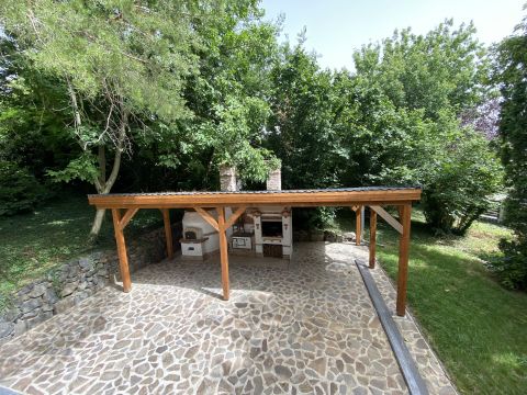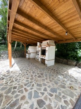 A ház mellett fedett teraszos nyári konyha kapott helyet , nem csak a sütés-főzés praktikus helyszíne nyaranta, de hangulatos látványeleme is a kertnek, ahol szívesen gyűlik össze a család és a vendégek.