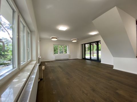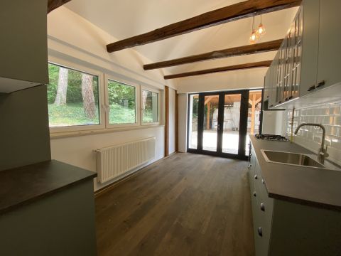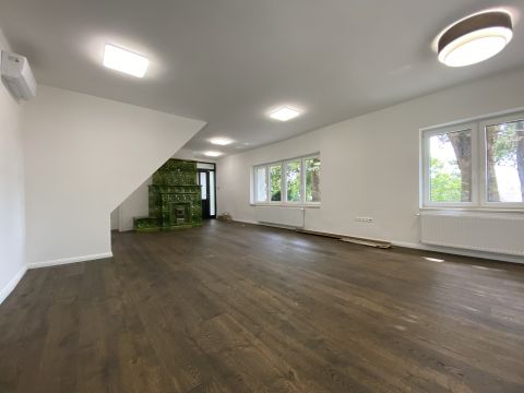 A napfényes nappali központi részét hangulatos, épített cserépkályha díszíti.