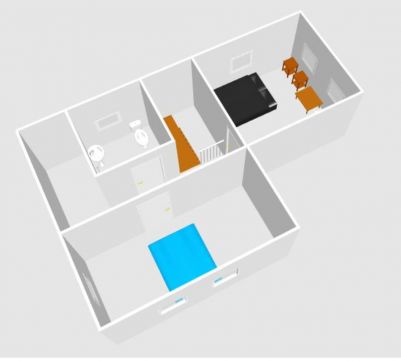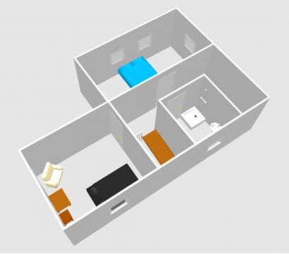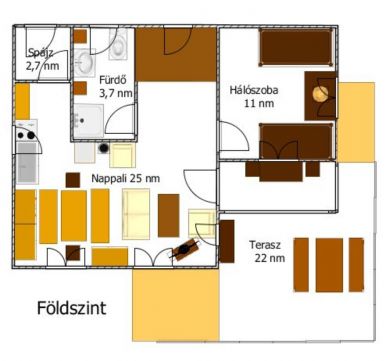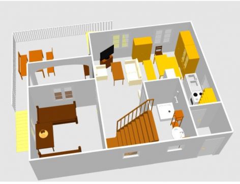 Két szinten, összesen 89 nm nettó területen van elosztva a nagy közösségi tér (nappali-étkező-konyha), egy hálószoba, egy fürdőszoba és egy spejz a földszinten, ahová nagy teraszon keresztül juthatunk. Az emeleten két nagy hálószoba, fürdőszoba és egy pakolós helyiség kapott helyet.