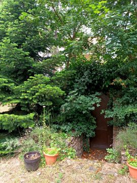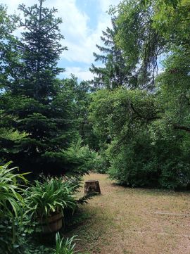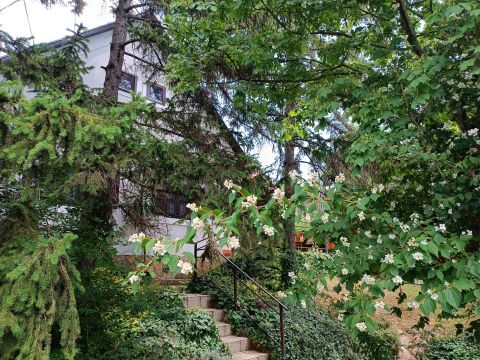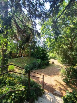 A kertben nagy fák adnak árnyékot, minden oldalról magas örökzöldek védik a házat a kíváncsiskodó tekintetektől. Egy kis földi pince is van itt, amely nyáron is hűvös, tökéletes klímát teremtve a tárolandó boroknak. Az épület mögött egy kis szerszámtároló áll. Garázs nincsen, de a feljárón 3 személyautó kényelmesen elfér.