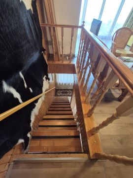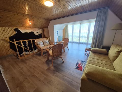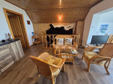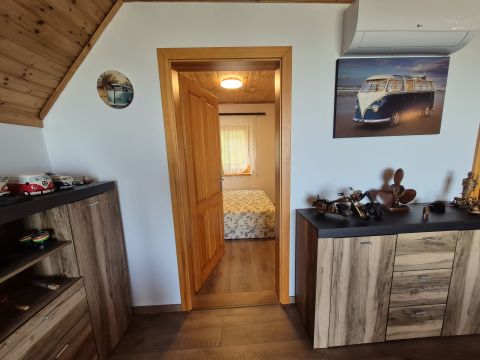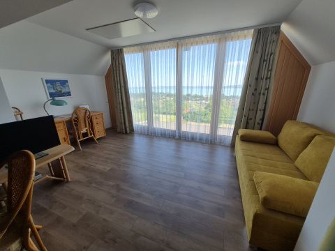 Az emeleten egy nagy, 35 nm-es nappaliból élvezhetjük a Tihanytól Fonyódig tartó balatoni panorámát egy hatalmas hővédő üvegfelületen keresztül, és emellett két hálószoba is található még ezen a szinten.