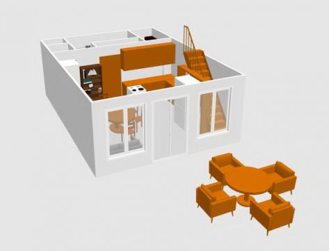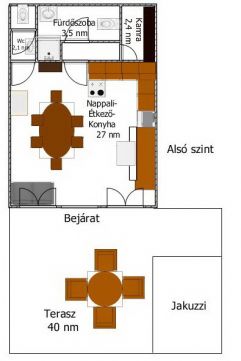 Az alsó szinten egy étkező-konyha-nappali fogad minket, mely közvetlenül kapcsolódik a 40nm-es teraszhoz, melynek minden pontjáról csodálatos panorámában gyönyörködhetünk.
