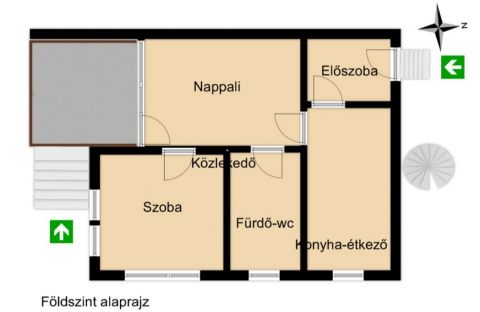 Elrendezése: Előszoba, nappali, konyha-étkező, hálószoba, fürdő-wc a földszinten. A nappaliból tágas teraszra léphetünk ki, ami félig fedett loggia jellegű. A party zóna a felső szinten található, 53 négyzetméter egybenyitva a padlástérben, fürdőszobával kiegészítve. Külön bejárattal megközelíthető külső csigalépcsőn keresztül.