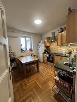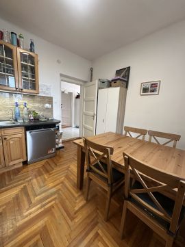 A konyha külön történet. Parkettás padlója melegséget ad, a konyhabútor karaktert, a légkondicionáló pedig kényelmet. Az étkezőasztalnál 4–6 ember is kényelmesen elfér.