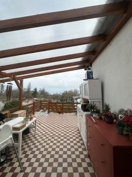 A kertből egy olyan terasz vezet a házba, ami több, mint egyszerű átjáró. Méretéből adódóan egy egész család élvezheti innen asztal mellett ülve a balatoni panorámát.