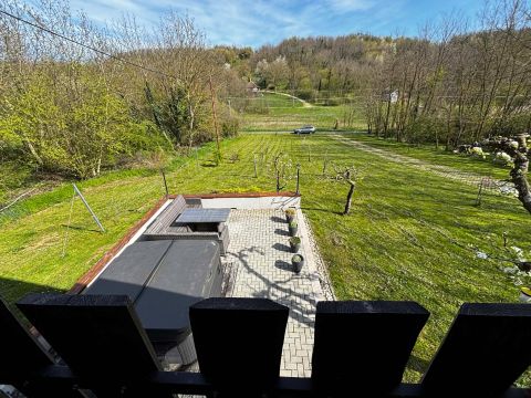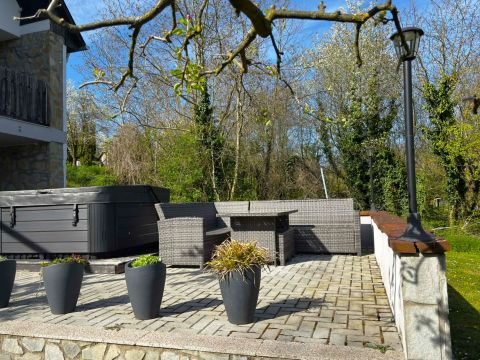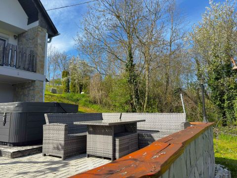 A térkövezett, 30 nm-es teraszon kerti bútor és 4 személyes jakuzzi várja a kikapcsolódni , pihenni vágyó vendéget.