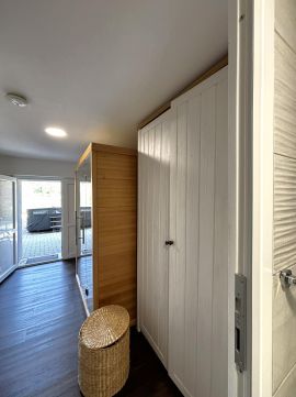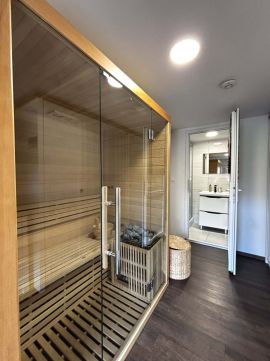 Az emeleten egy légtérben, hálószoba , konyha-étkező, a földszinten , fürdőszoba, finn szauna, tároló kapott helyet.