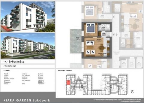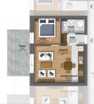 A hirdetésben szereplő lakás FÖLDSZINTI, nappali + 1 szobás, alapterülete 35,52 nm + 12 nm terasz tartozik hozzá.