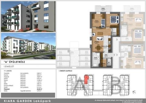 A hirdetésben szereplő lakás ELSŐ emeleti, nappali + 2 szobás, alapterülete 62,6 nm + 5,78 nm terasz tartozik hozzá.