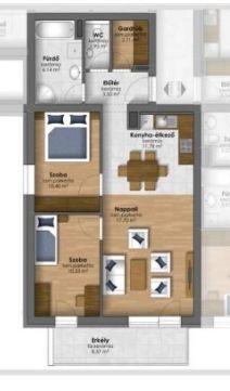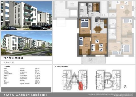 A hirdetésben szereplő lakás HARMADIK emeleti, nappali + 2 szobás, alapterülete 64,88 nm + 8,57 nm terasz tartozik hozzá.