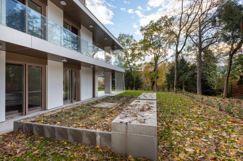 A dús növényzettel teli, 2234 m2-es telekre épült 3 szintes ingatlan a városi kényelem és a természetközeli élet ideális kombinációját kínálja. A tervezés során kiemelten ügyeltek a privát terekre. Nagy figyelmet kapott a praktikusság, a tágas élettér és a kényelmes, jól kihasználható teraszok kialakítása, melyek alapterületének arányos része a megadott összterületbe is beleszámít. A teraszok jacuzzival és pergolával felszereltek.