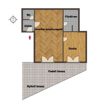 D1 Lakás: első emeleti, 56m2-es lakótérrel, amerikai konyha nappali+1 szoba, fürdő-wc elosztású ingatlan 36 m2-es terasszal. Ár:  99.900.000 Ft.