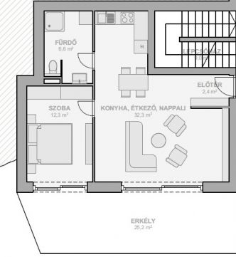 C1 Lakás: első emeleti, 54m2-es lakótérrel, amerikai konyha nappali+1 szoba, fürdő-wc elosztású ingatlan 26 m2-es terasszal. Ár:  97.900.000 Ft.