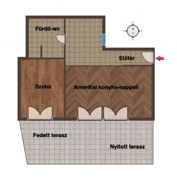 D1 Lakás: első emeleti, 56m2-es lakótérrel, amerikai konyha nappali+1 szoba, fürdő-wc elosztású ingatlan 36 m2-es terasszal. Ár:  99.900.000 Ft.