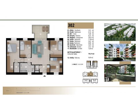 A harmadik emeleten 81 nm-es, nappali + 3 szobás, K-i tájolású lakás eladó 10 nm-es erkéllyel.