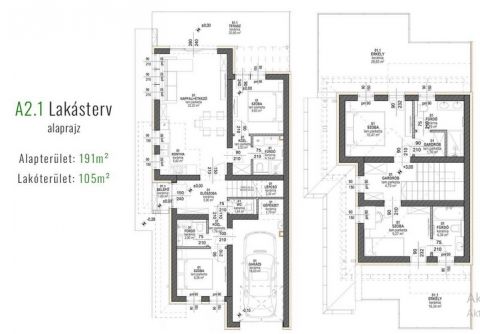A lakóparkban eladó E1-2-es számmal megjelölt ikerház bal oldala. Az ikerházban 1 db garázs 5 szoba és amerikai konyhás nappali található. A nappali közvetlen kert kapcsolatos. A két lakóegység összesen 908 nm-es telken épül fel.