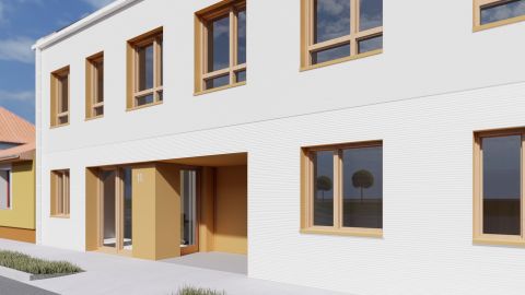 Homlokzaton kívül aranytölgy, belül fehér (udvari részen kívül tölgy, belül fehér) 6 légkamrás műanyag nyílászárók kerülnek beépítésre 3 rétegű üvegezéssel vakolható redőnytokokkal. A tetőtérben Velux, vagy ezzel egyenértékű fa ablakok kerülnek beépítésre.