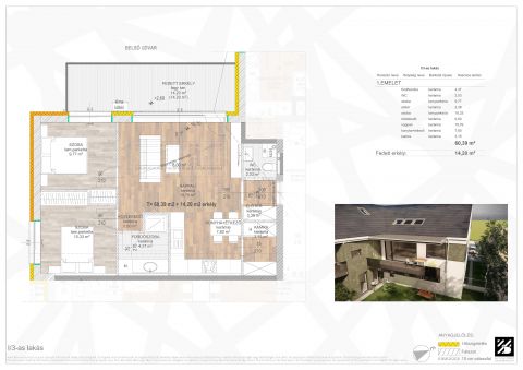 A társasház 1. emeletén eladó egy 60 nm-es, nappali + 2 szobás lakás, 14 nm terasszal.