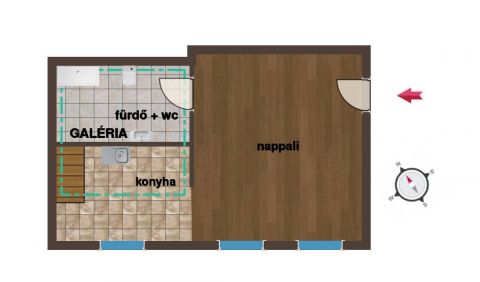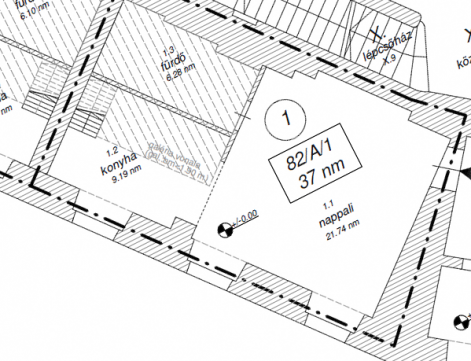 A1 lakás: A földszinti ingatlan 37 m2 alapterületű, nappali, konyha és fürdőszoba kapott helyet benne, mivel a belmagasság lehetővé teszi, egy hálónak is alkalmas galéria is kialakításra került.