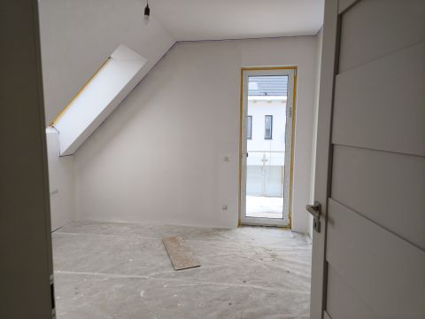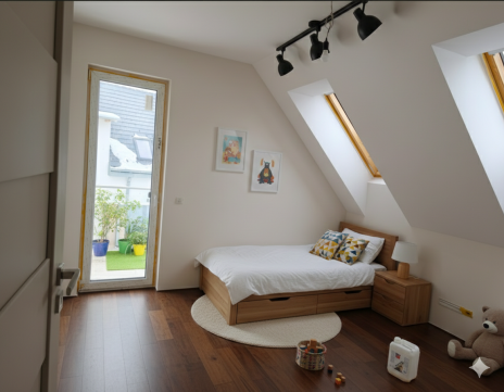 Tetőtérben fokozott hőszigetelésű, középen billenő, Velux GLL tetősík ablak. Felületkezelés: kívül fémlemezzel azonos színben, belül lakkozott kivitel. Elektrogalvanizált zár és dörzsfékes vasalat.