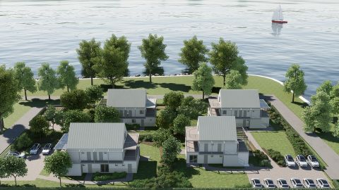 Modern kialakítás, nagy kertek, hatalmas teraszok, panorámás penthouse lakások, önálló hőszivattyús rendszerek, padlófűtés, elektromos redőnyök, nagy üvegfelületek mindez néhány lépésre a vízparttól.