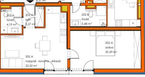 A 202.A számú lakás a hatszintes épület 2.emeletén található. Hasznos alapterülete 50,37 m2, melyben amerikai konyha+ nappali, háló, fürdő és előtér került kialakításra. A környezettel való kapcsolatot a nappaliból és a hálóból elérhető franciaerkély biztosítja.