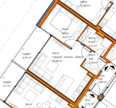 A 204.A számú lakás a hatszintes épület 2.emeletén található. Hasznos alapterülete 42,21 m2, melyben amerikai konyha+ nappali, háló, fürdő és előtér került kialakításra. A környezettel való kapcsolatot a nappaliból és a hálóból elérhető 6,93 m2-es loggia biztosítja.