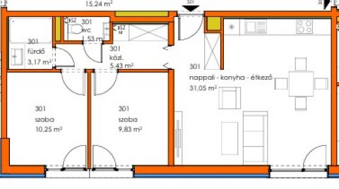 A 301. számú lakás a hatszintes épület 3.emeletén található. Hasznos alapterülete 61,26 m2, melyben amerikai konyha+ nappali, 2 fél szoba, fürdő és szeparált mellékhelyiség került kialakításra. A környezettel való kapcsolatot a nappaliból és a szobákból elérhető franciaerkély biztosítja.