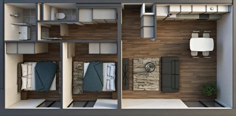 A lakások alapterülete 32 m2- 80 m2 közötti, nagy üvegfelülettel, világos terekkel készülnek.