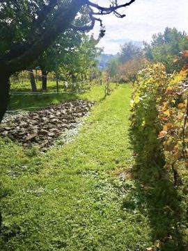 A gondozott kertben többféle gyümölcsfa található: cseresznye, őszibarack, szilva, alma és diófa.