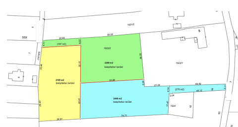 A telek egy 6 843 m2-es területből lett kialakítva 3 db különböző méretben és 3 db helyrajzi számon. Már csak 2 db eladó, ami egyben is megvásárolható kedvező áron. Ez a rész teljesen körbekerített.Rajzon sárga jelzéssel van jelölve a telek mérete és formája. A zöld színű terület ami még eladó.