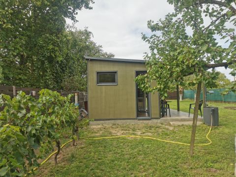 Tata Látóhegyen eladó egy 744 m2-es telek egy új könnyűszerkezetes kis házzal.