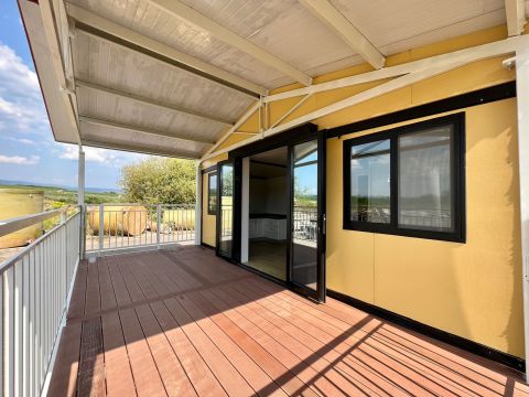Nagy fedett terasz Masszív acélvázas veranda, korláttal tökéletes kültéri étkezéshez, pihenéshez vagy nyaralásra.