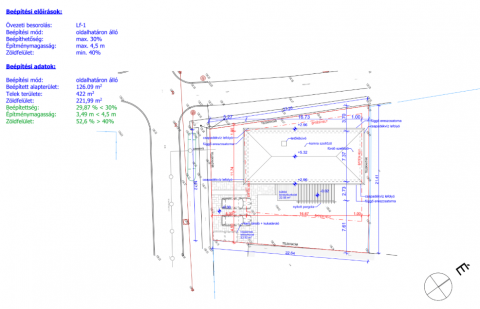 A telek 30%-os beépíthetőséggel rendekezik, 126 nm-es lakóház építhető rá.