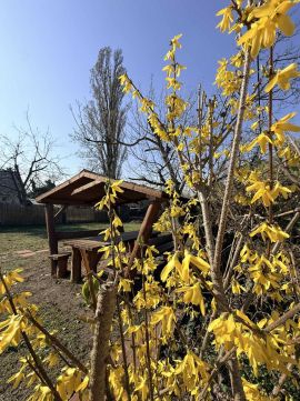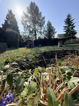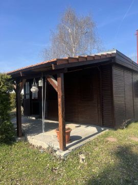 Közművek: Villany bekötve, a víz és a csatorna már telken belül (előkészítve). A kertet fúrt kútról üzemelő locsolórendszer tartja rendben.