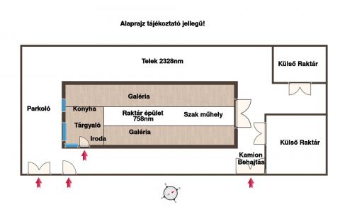 - 483 nm-s alapterületű acélvázas, fűtött, szigetelt trapézlemez raktár/műhely, amely 1 db 4x4 m-es szekcionált kapuval és 2 db, 2.4x3.3 m-s nyíló kapuval, pormentes ipari beton aljzattal rendelkezik.