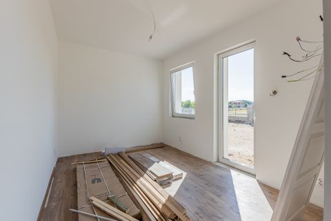 Az épület 40cm vastag fallal épül, műanyag nyílászárókkal 3 rétegű hőszigetelt üvegezéssel, Terrán Zenit Resistor Onix tetőcserép fedéssel, hőszivattyú kiállással, padlófűtéssel, napelem-, riasztó-, és klímaelőkészítéssel, illetve egy klíma egységgel a nappaliban.