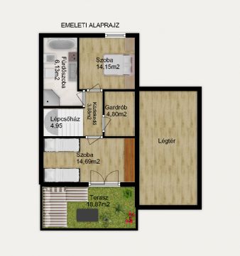 Az emeleten két szoba, fürdőszoba, gardrób és a grandiózus terasz lesz kiépítve.