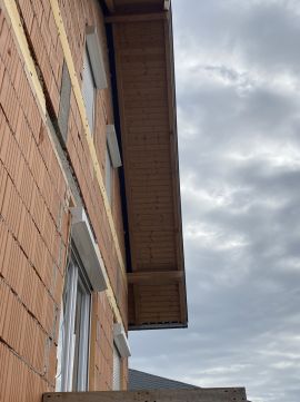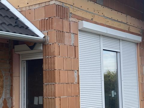 A tervek alapján a meglévő 30-as Porotherm tégla falak további 15cm homlokzati hőszigetelést kapnak. A tető szürke betoncserép fedésű, ebbe 30 cm hőszigetelés kerül beépítésre. A meglévő közbenső födém E gerendás. Műanyag nyílászárókkal rendelkezik a ház, 3 rétegű üvegezéssel. A fűtés-melegvíz ellátás a terv szerint hőszivattyús, de módosítható gázcirkó + napelemes változatra.