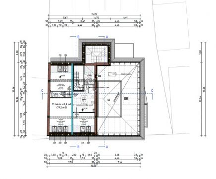 A lakás bruttó 79,2 nm nettó 63,8 nm, tetőtéri lakás.