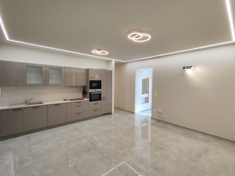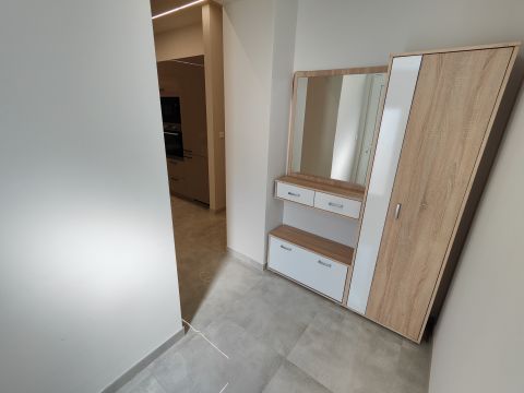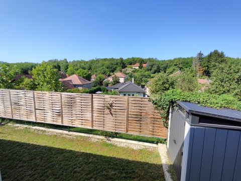A világos nappaliból közvetlen kertkapcsolatos, épített terasz nyílik, amelyhez gondozott zöldfelület és automata locsolórendszer tartozik.