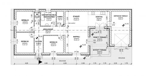 - fedett terasszal kapcsolatos konyha- étkező- nappali, 3 kényelmes méretű hálószoba, fürdőszoba és külön WC, mosókonyha és széles közlekedő