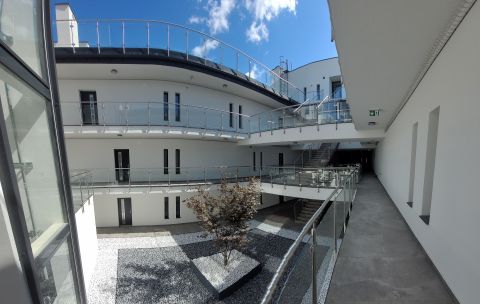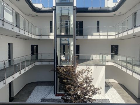 Az épület akadálymentesített, a felső szintek megközelítését üvegfalú, panoráma lift biztosítja.