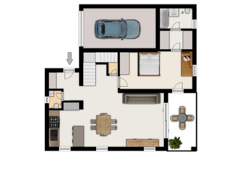 A családi élet központjaként szolgáló nappali-konyha-étkező 40 négyzetméter alapterülettel rendelkezik, amelyhez kertkapcsolattal rendelkező terasz tartozik.