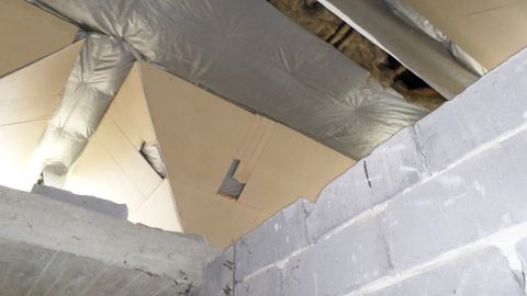 A tetőtérben közlekedő, 3 hálószoba és egy fürdőszoba van tervezve, de itt a válaszfalak még nem épültek meg.