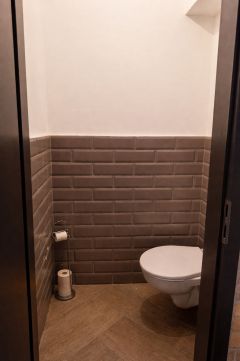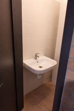 Az üzlet hátsó részében külön bejáratú WC és kézmosó található.
