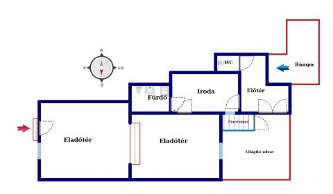 Az üzlethelyiség utcafronti bejárattal és kirakattal rendelkezik, amely biztosítja a jó láthatóságot és a könnyű hozzáférést az ügyfelek számára.