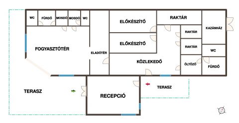 Az épület alsó szintjén recepció található, valamint korábban gyros-ként működött az ingatlan egy részében. A helyiségek elrendezése miatt továbbra is alkalmas lehet szálláshely, iroda, szolgáltató egység vagy vendéglátóhely kialakítására.