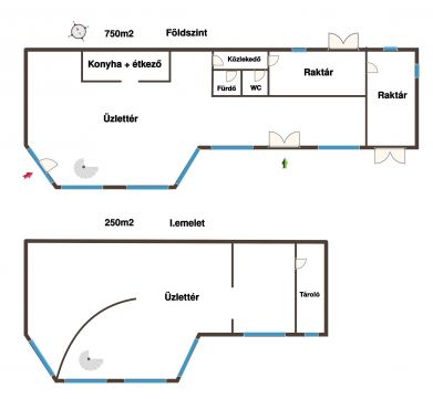 A földszint nagy alapterületű, jól átlátható üzlettérrel rendelkezik, természetes fényben gazdag terekkel. Ezen a szinten található: